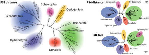 (A phylogenetic trees of the Chlorophyceae, which reconstructed by FST distance (left) using the full kernel score, F84 distance estimation on a Muscle alignment (top right) and maximum-likelihood tree on the same Muscle alignment (bottom right).)